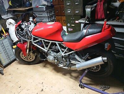 1994 Ducati 900ss. Bike is almost complete as shown in pictures. The bike was stored in boxs for years after a crack appeared in the head stock weld. The frame has now had a gusset welded to the head stock in front of the airbox as shown in pictures. The bike runs but has not been ridden since being rebuilt. It has new Bridgestone tyres and new battery. It has steel carbon can company silencers + the originals a Corbin seat + original. It needs timing belt covers fitting. needs a banjo bolt for the clutch, fairing standoffs in order to fit fairings and a new front wheel speedo drive. The paint has some scratches and chips. I am selling due to sale of house and cant take it with me.