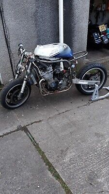 Hard up choppers Savage cafe racer frame suzuki 600 bandit engine Black widow down pipes T595 front end triumph trophy six spoke wheels neverland rear sets uprated oil cooler. I have v5 in my name for engine and frame plate. This is a project. Comes with a box of parts and a pair of bandit wheels. I have had bike running as in video but does need bracket making fitting etc. paddock stand and battery is not included only borrowed it to run bike safely. Please fill free to message me with questions and I’ll answer as soon as I can.